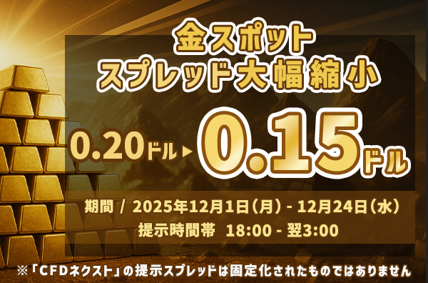 12月1日(月)より『CFDネクスト』にて「金スポット」の現在の提示スプレッド※を大幅に縮小いたします。非常に注目度の高い「金スポット」のお取引をぜひこの機会にお試しください。