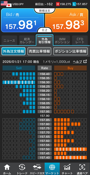 現状レベルの上側では、157.950円、158.050円、158.100円、158.150円、158.200円、158.250円、158.300円、158.350円、158.400円に売りが観測されているほか、157.950円、158.250円、158.400円にストップ買いが確認される。