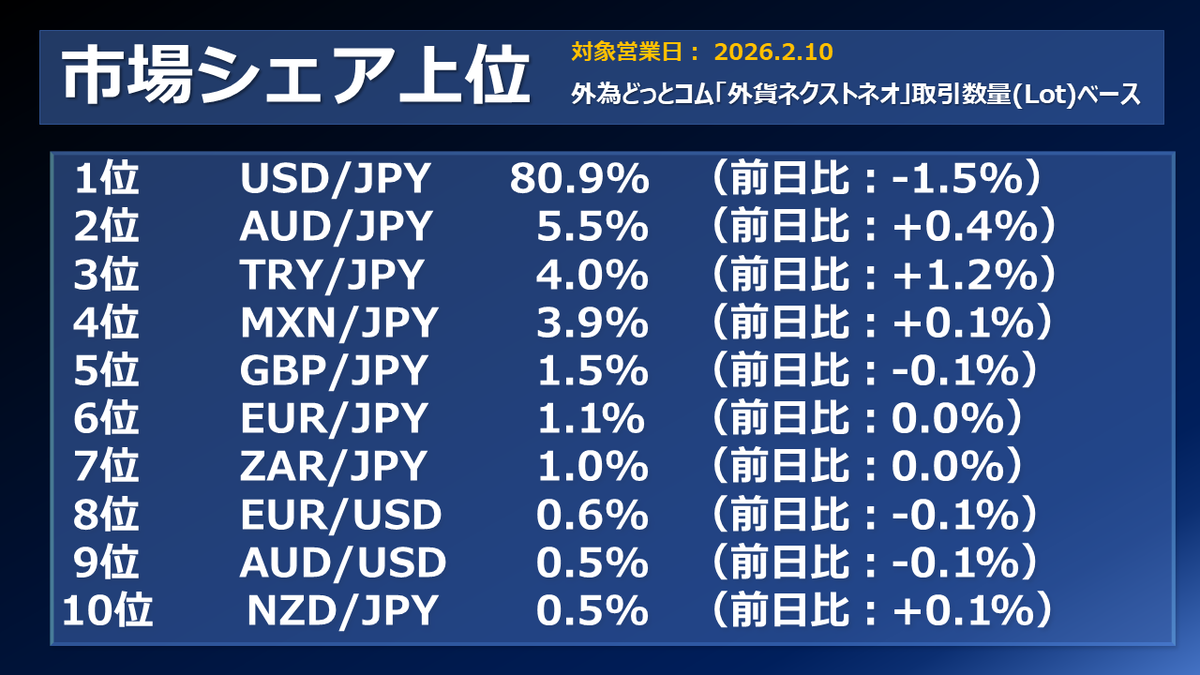 外為どっとコムのFX取引サービス「外貨ネクストネオ」取り扱い通貨30通貨ペアの内、取引量が多かった上位10位です。