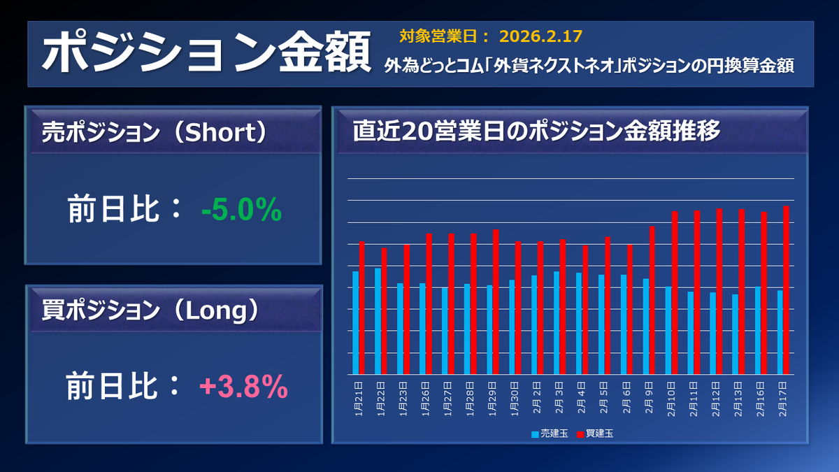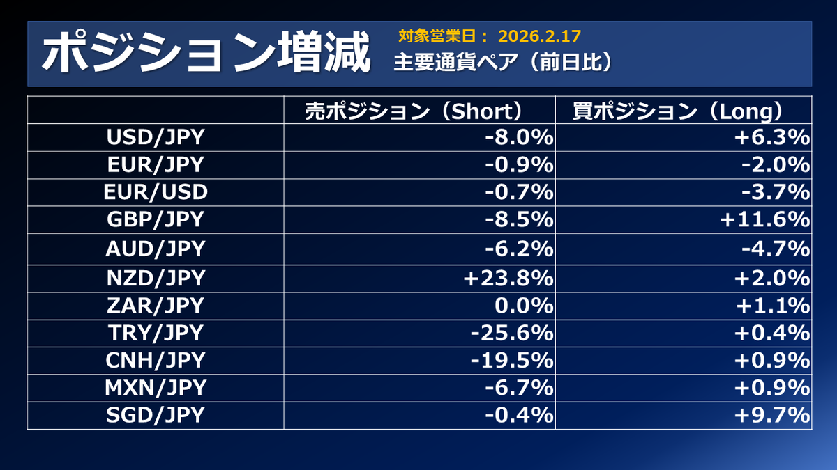外為どっとコムのFX取引サービス「外貨ネクストネオ」主要通貨ペアのポジション増減(前日比)です。