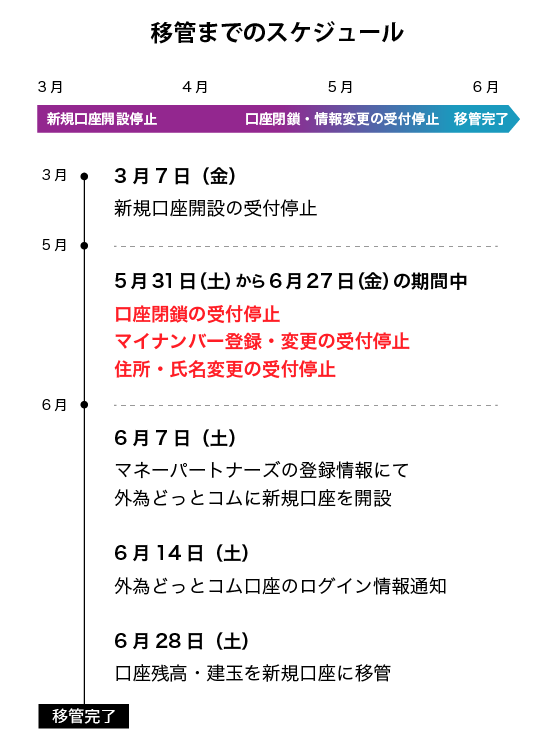 ただし、すでに外為どっとコムの口座をお持ちの場合、6月6日(金)営業終了時点でのマネーパートナーズの口座残高の有無により移管の扱いが異なります。