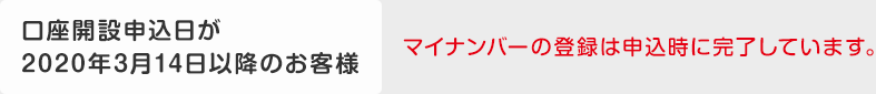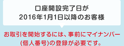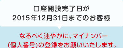 2015年12月末時点で当社に口座開設されているお客様は、速やかに当社へマイナンバー(法人のお客様は法人番号)をご登録いただく必要がございます。