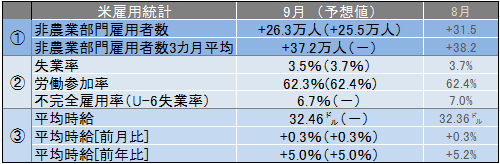 ①9月の非農業部門雇用者数は前月比26.3万人増と市場予想の25.5万人増を上回った。レジャー・接客が8.30万人増加するなど、今回も幅広い業種で雇用が増加した。ただ、全体の増加幅は今年最低となり、3カ月平均(37.2万人)を下回った。