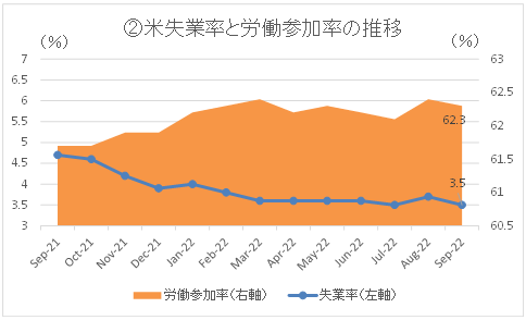 ②9月の失業率は3.5%となり、前月比横ばいの3.7%を見込んでいた市場予想を下回った。フルタイムの職を希望しながらパート就業しかできない人なども含めた広義の失業率である不完全雇用率(U-6失業率)も、前月の7.0%から6.7%へと低下した。労働力人口に占める働く意欲を持つ人の割合である労働参加率が前月の62.4%から62.3%へと低下したことも失業率を押し下げた。