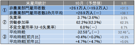①10月の非農業部門雇用者数は前月比26.1万人増と市場予想の19.3万人増を上回ったが、前月の31.5万人増(26.3万人増から修正)から伸びが鈍化した。この結果3カ月平均の増加幅は28.9万人となり、今年初めて30万人を下回った。