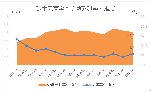 ②10月の失業率は3.7%と市場予想の3.6%を上回り、前月の3.5%から0.2ポイント悪化した。フルタイムの職を希望しながらパート就業しかできない人なども含めた広義の失業率である不完全雇用率(U-6失業率)も、前月の6.7%から6.8%へと上昇した。一方、労働力人口に占める働く意欲を持つ人の割合である労働参加率は前月の62.3%から62.2%へと低下した。