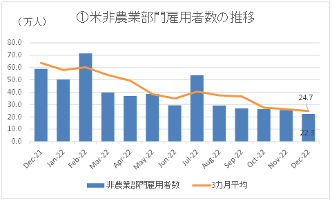 ①12月の非農業部門雇用者数は前月比22.3万人増と市場予想の20.5万人増を上回ったが、前月の修正値25.6万人増から伸びが鈍化した。基調を判断する上で重要視される3カ月平均の増加幅は24.7万人で、2021年1月以来ほぼ2年ぶりの低水準となった。