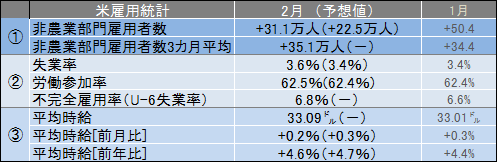 ①2月の非農業部門雇用者数は前月比31.1万人増と市場予想の22.5万人増を上回った。前月分は51.7万人増から50.4万人増へと下方修正された。基調を判断する上で重要視される3カ月平均の増加幅は35.1万人となり、2022年9月以来の水準に上昇した。米国の雇用市場の底堅さがあらためて確認された。