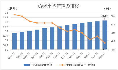 ③3月の平均時給は33.18ドルと前月の修正値33.09ドルから0.09ドル増加した。伸び率は前月比+0.3%、前年比+4.2%であった。市場予想は前月比+0.3%、前年比+4.3%だった。前年比の伸び率は2021年6月以来の低さとなっており、賃金インフレ圧力は和らぎつつあるようだ。