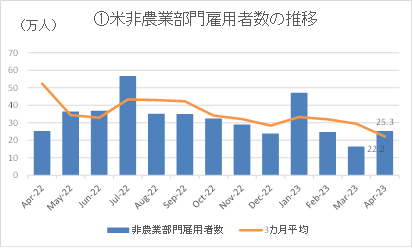 米労働省が2023年5月5日に発表した4月雇用統計の主な結果は、①非農業部門雇用者数25.3万人増、②失業率3.4%、③平均時給33.36ドル(前月比+0.5%、前年比+4.4%)という内容であった。