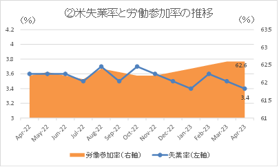②4月の失業率は3.4%となり、前月から0.1ポイント低下。1月に記録した約54年ぶりの低水準に並んだ。市場予想は前月から0.1ポイント上昇の3.6%であった。フルタイムの職を希望しながらパート就業しかできない人なども含めた広義の失業率である不完全雇用率(U-6失業率)も、前月の6.7%から6.6%へと低下した。労働力人口に占める働く意欲を持つ人の割合である労働参加率は前月から横ばいの62.6%であった。