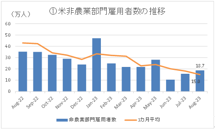 ①8月の非農業部門雇用者数は前月比18.7万人増と市場予想の17.0万人増を上回った。ただし、7月分の増加幅が18.7万人から15.7万人へ、6月分が18.5万人から10.5万人へとそれぞれ下方修正された。このため、米雇用市場の基調的な動きを見る上で重視される非農業部門雇用者数の3カ月平均の増加幅は15.0万人にとどまり、コロナ禍で大幅減を記録した2020年6月以来の低水準となった。