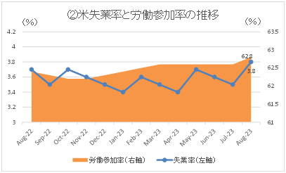 ②8月の失業率は3.8%と、市場予想および前月の3.5%を上回り2022年2月以来の水準に上昇した。フルタイムの職を希望しながらパート就業しかできない人なども含めた広義の失業率である不完全雇用率(U-6失業率)も、前月の6.7%から7.1%へと上昇。労働力人口に占める働く意欲を持つ人の割合である労働参加率が62.6%から62.8%へと上昇したことも失業率の悪化につながった。なお、労働参加率の62.8%は2020年2月以来の高水準。