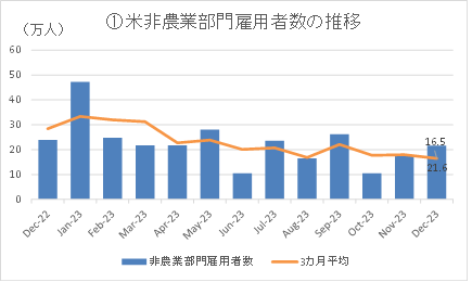 ①12月の非農業部門雇用者数は前月比21.6万人増と市場予想の17.5万人増を上回った。政府部門や娯楽・接客などの業種が雇用の増加をけん引。半面、運輸・倉庫では減少した。米労働市場の基調的な動きを捉える3カ月平均の雇用者の増加幅は16.5万人。10月と11月の雇用者数が合計で7.1万人分下方修正されたこともあって2021年1月以来の低水準となった。なお、2023年の合計雇用者数は約270万人となり、前年2022年の約480万人から大幅に減速した。
