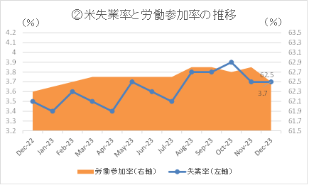 ②12月の失業率は3.7%と、前月から横ばいとなった。市場予想は3.8%だった。フルタイムの職を希望しながらパート就業しかできない人なども含めた広義の失業率である不完全雇用率(U-6失業率)は、前月の7.0%から7.1%へと上昇した。労働力人口に占める働く意欲を持つ人の割合である労働参加率は前月の62.8%から62.5%に低下した。