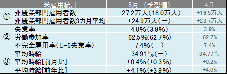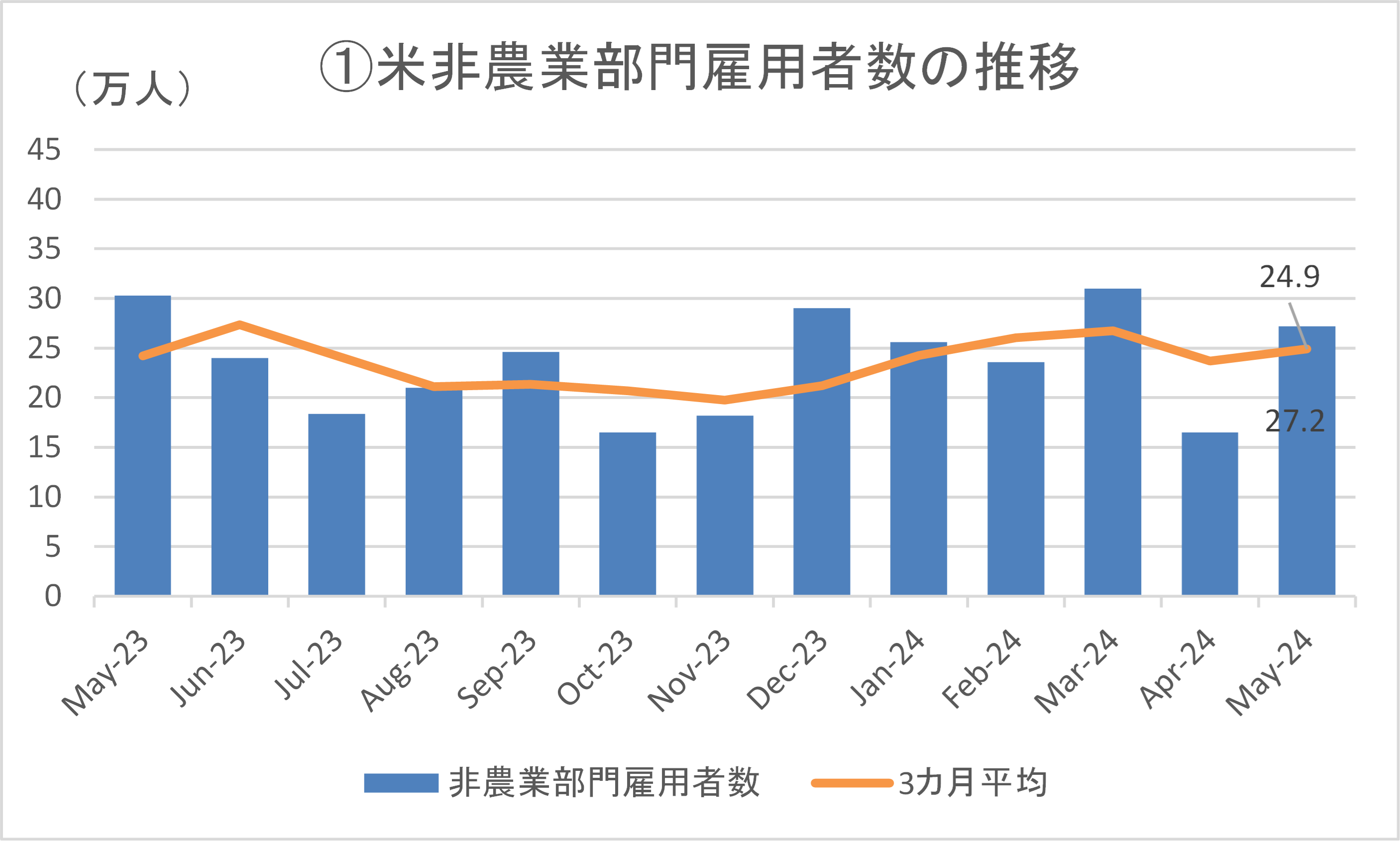 ①5月の非農業部門雇用者数(季節調整済)は前月比27.2万人増と市場予想の18.0万人増を上回った。この結果、米国の雇用情勢の基調を判断する上で重要視される3カ月平均の増加幅は24.9万人と前月時点の23.7万人から拡大した。