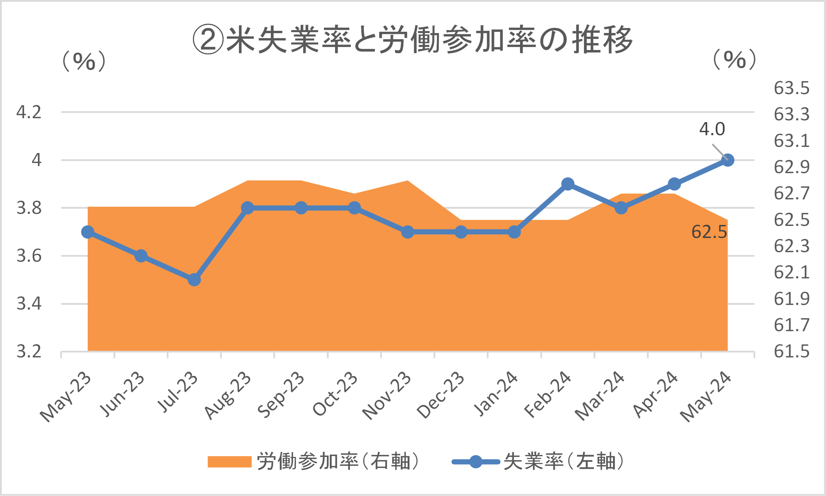 ②5月の失業率(季節調整済)は4.0%と市場予想の3.9%を上回り、2022年1月以来の水準に悪化した。フルタイムの職を希望しながらパート就業しかできない人なども含めた広義の失業率である不完全雇用率(U-6失業率)は2021年11月以来の高水準だった前月に続いて7.4%であった。労働力人口に占める働く意欲を持つ人の割合である労働参加率は前月から0.2ポイント低下して62.5%だった。