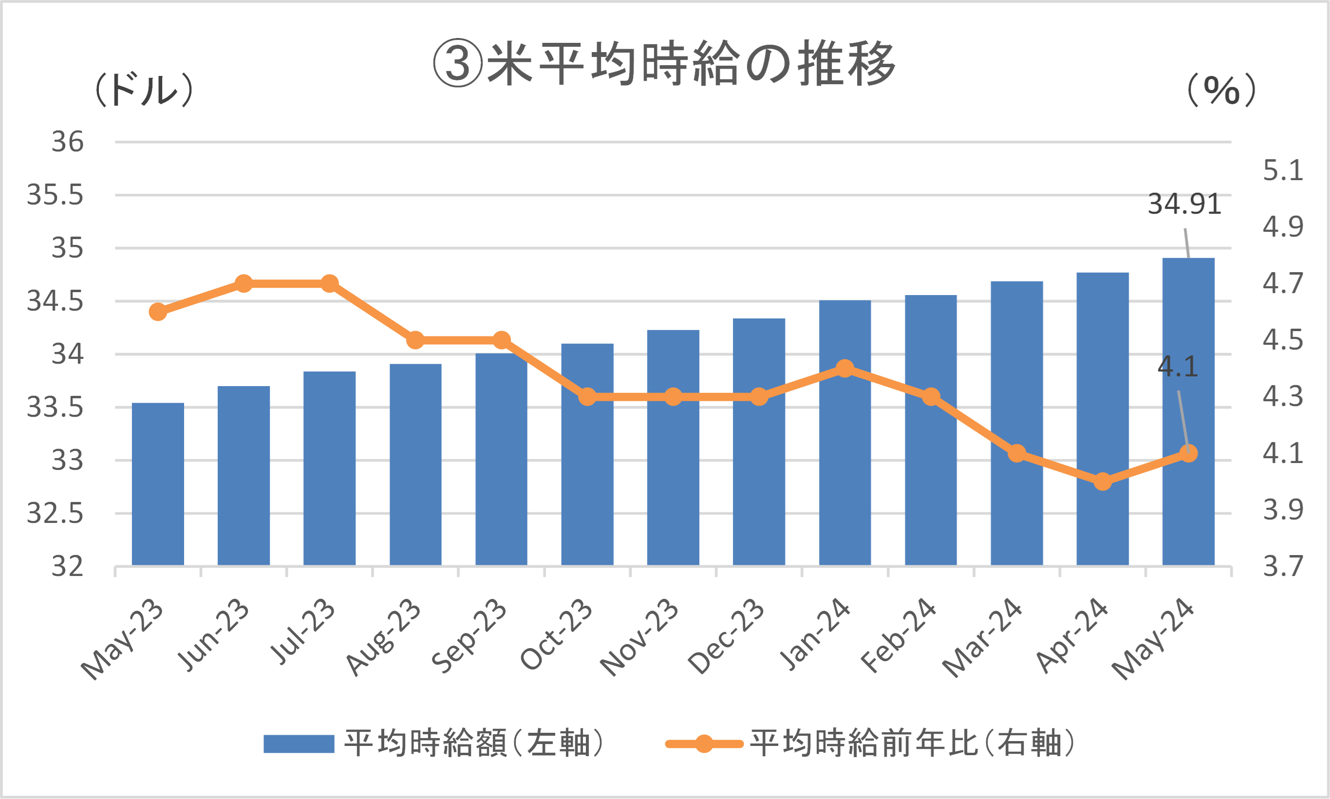 ③5月の平均時給(季節調整済、全従業員)は34.91ドルと前月の修正値34.77ドルから0.14ドル増加。伸び率は前月比+0.4%、前年比+4.1%で、いずれも市場予想(+0.3%、+3.9%)を上回った。なお、2021年6月以来の低さだった前月の前年比の伸び率は3.9%から4.0%に上方修正された。