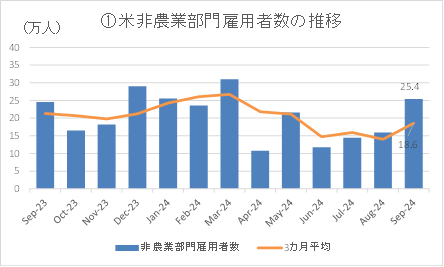 米労働省が2024年10月4日に発表した9月雇用統計の主な結果は、①非農業部門雇用者数25.4万人増、②失業率4.1%、③平均時給35.36ドル(前月比+0.4%、前年比+4.0%)という内容であった。