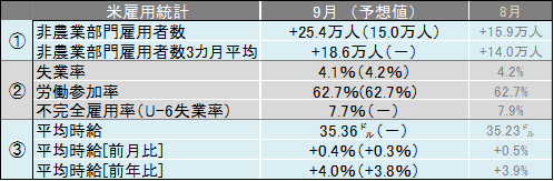 ③9月の平均時給は35.36ドルと前月の修正値35.23ドルから0.23ドル増加した。伸び率は前月比+0.4%、前年比+4.0%で、市場予想は前月比+0.3%、前年比+3.8%だった。前年比の伸び率は2カ月連続で拡大。4カ月ぶりに4%台に乗せており、鈍化基調は今年7月に一旦終了した可能性がある。