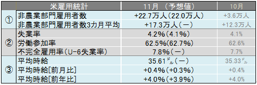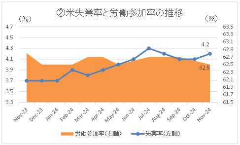 ②11月の失業率は4.2%と前月の4.1%から上昇。市場予想も4.1%だった。フルタイムの職を希望しながらパート就業している人などを含めた広義の失業率である不完全雇用率(U-6失業率)も7.8%と前月の7.7%から上昇した。労働力人口に占める働く意欲を持つ人の割合である労働参加率は62.5%と前月から0.1ポイント低下。市場予想(62.7%)も下回った。