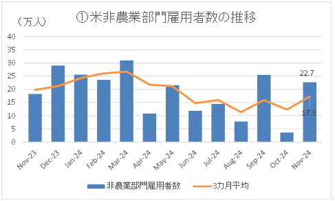 米労働省が2024年12月6日に発表した11月雇用統計の主な結果は、①非農業部門雇用者数22.7万人増、②失業率4.2%、③平均時給35.61ドル(前月比+0.4%、前年比+4.0%)という内容であった。