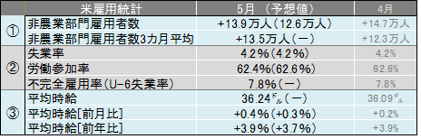 米労働省が2025年6月6日に発表した5月雇用統計の主な結果は、①非農業部門雇用者数13.9万人増、②失業率4.2%、③平均時給36.24ドル(前月比+0.4%、前年比+3.9%)という内容であった。
