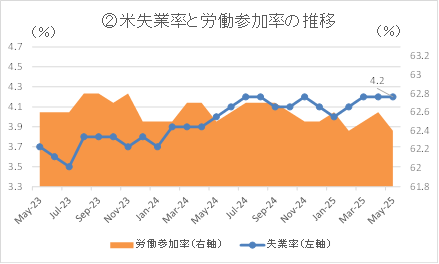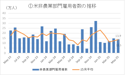 ①5月の非農業部門雇用者数は前月比13.9万人増と市場予想の12.6万人増を上回った。ただ、前2カ月分が合計で9.5万人と大幅に下方修正された。その結果、3カ月平均の雇用者数の増加幅は13.5万人へとやや拡大した。業種別ではヘルスケア部門とレジャー・ホスピタリティ部門で増加が目立った一方、関税の影響を受けやすい製造業では全体で8000人減少した。