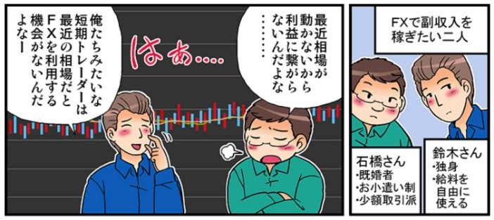 FXで副収入を狙う鈴木さんと石橋さん。相場動向が鈍いため利益につながらず、ややため息気味。