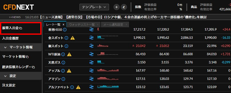 取引画面内、左メニュー「入出金」>「振替入出金」をクリックしマイページ画面へ遷移します。