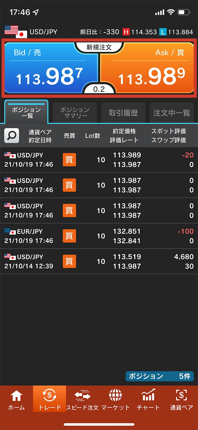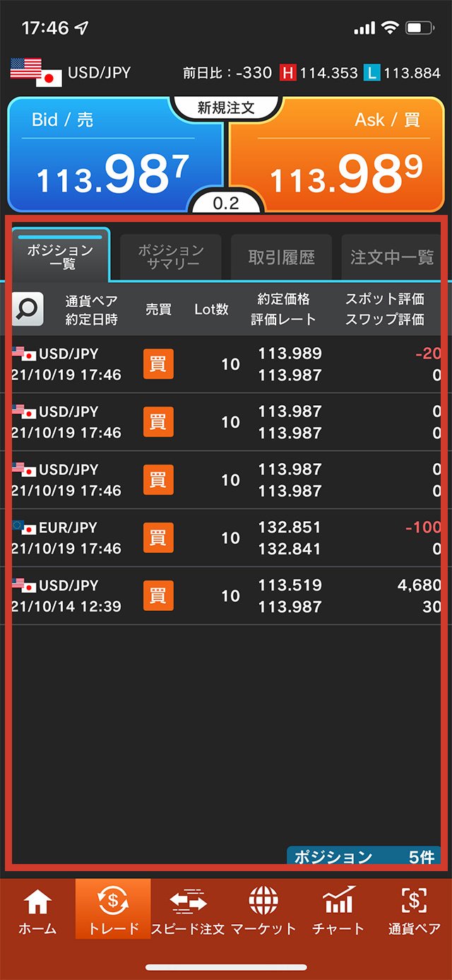 トレード画面内、ポジション一覧、ポジションサマリーから選択できます。