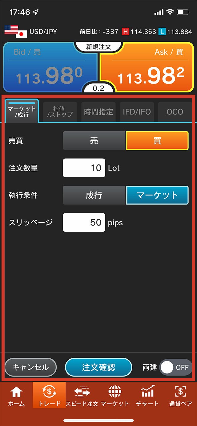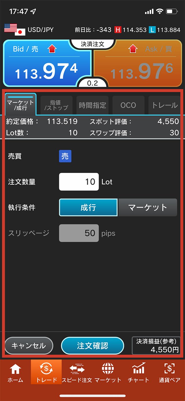 Lot数、各種設定などを入力後、「注文確認」をタップします。