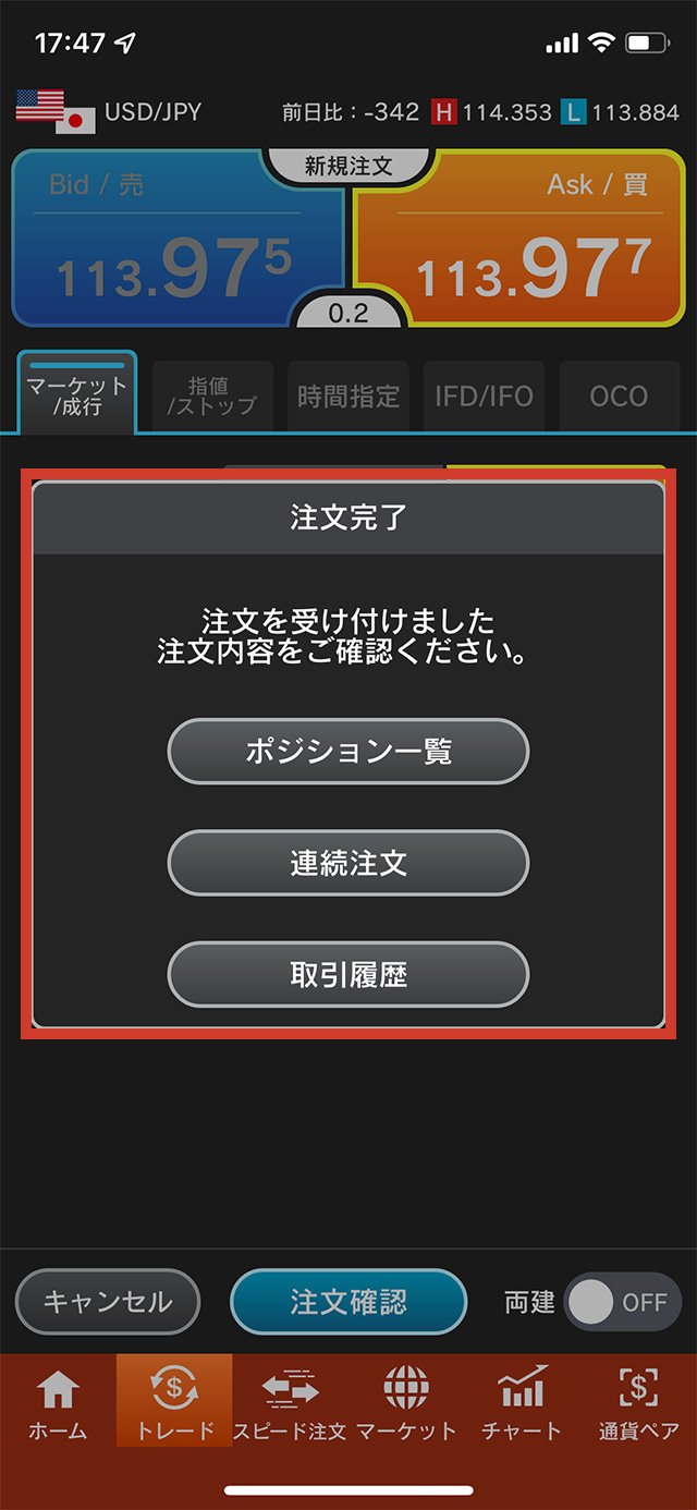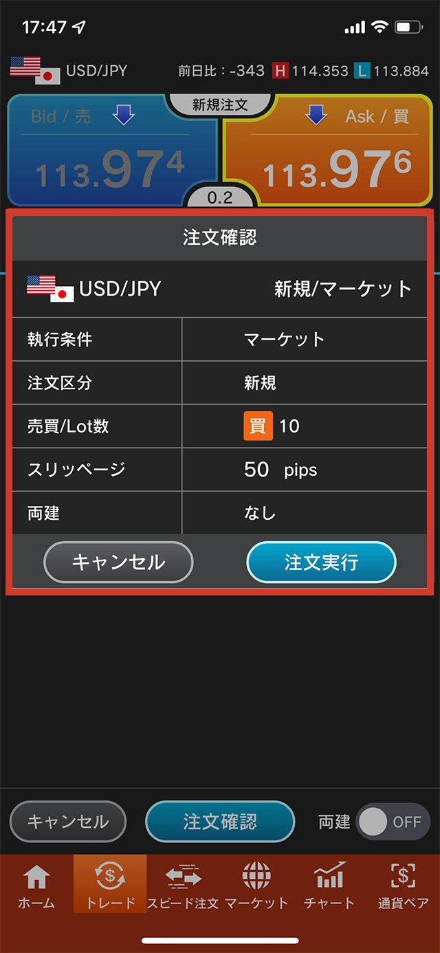 通貨ペア、Lot数などを入力後、「注文」をクリックします。