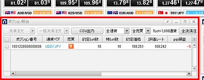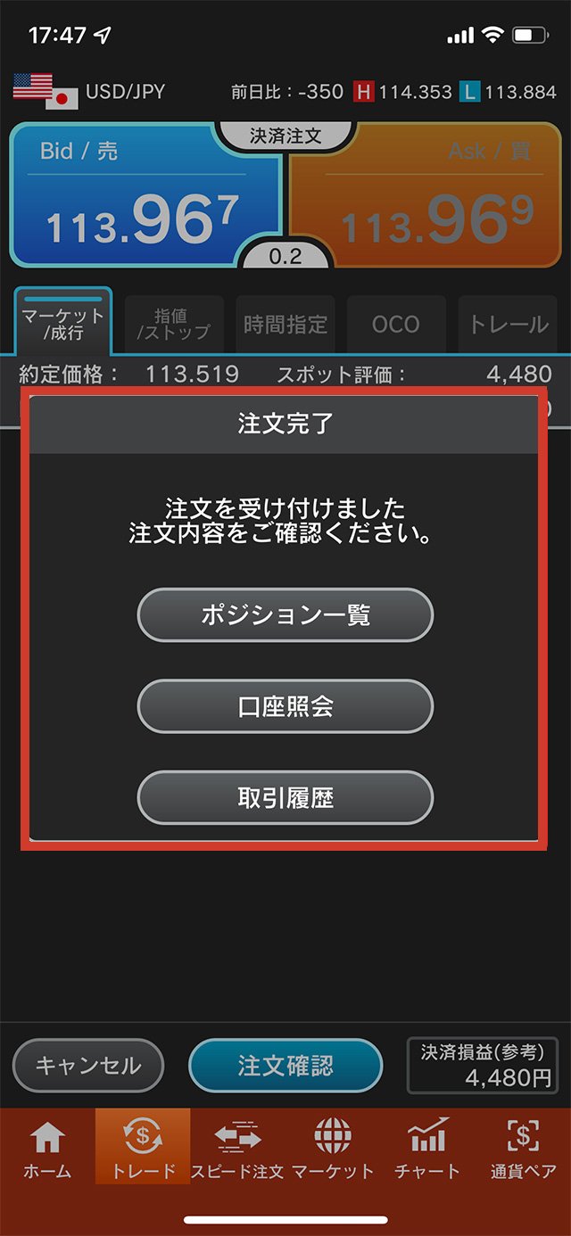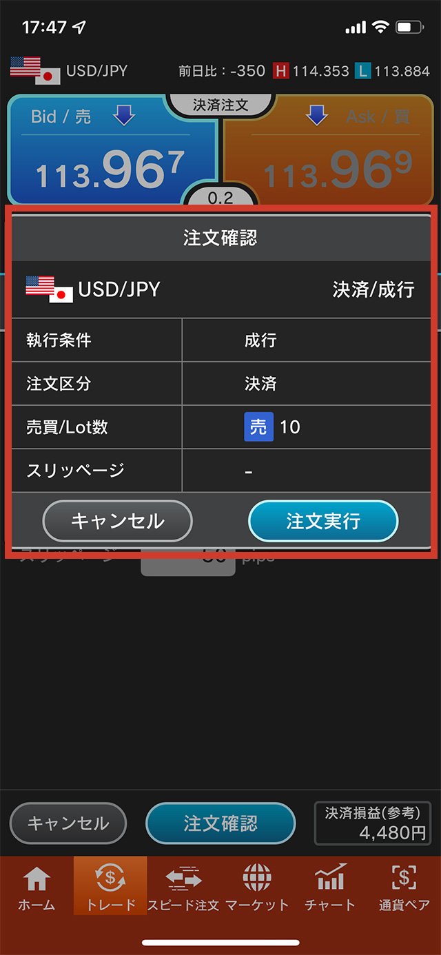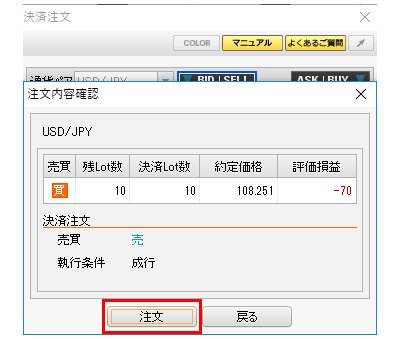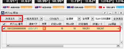 決済したいポジションを選択後、「決済注文」をクリックします。