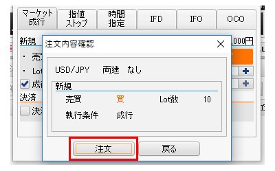Lot数、執行条件などを入力後、「注文」をクリックします。