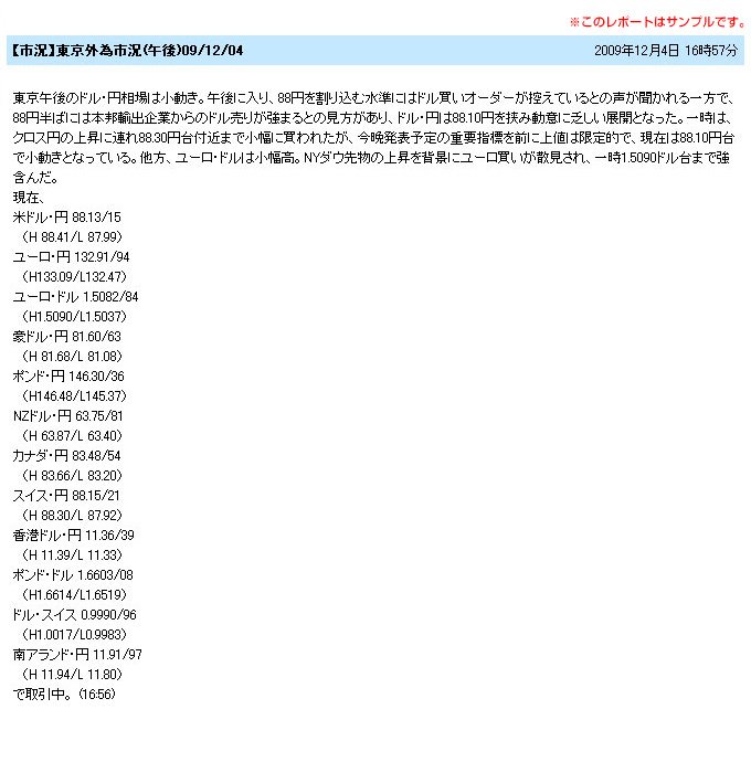 経済指標の結果、本日の要人発言予定、要人発言の要旨のほかに、経済指標の発表予定もお送りします。また、大台乗せなど相場が大きく動いたときにも、いち早くその情報をお送りします。