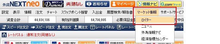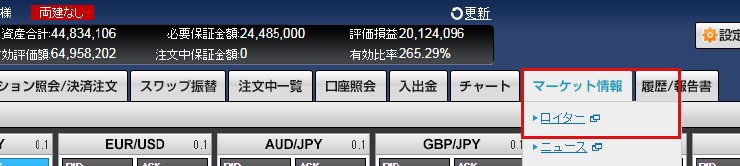 Webブラウザ版ログイン後、画面上部メニューバーの「マーケット情報」>『ロイター』からご利用ください。