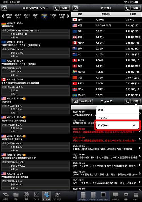 iPad版ログイン後、下部メニューバーの「マーケット」>『ロイター』からご利用ください。