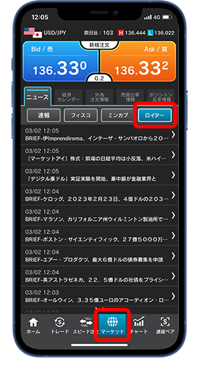 スマホアプリ版(GFX)ログイン後、下部メニューバーの「マーケット」>『ロイター』からご利用ください。