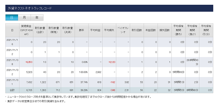 日々の取引結果を一覧形式で簡単に確認できます。実現損益や取引数量などを年次、月次、日次で表示することができるため、お取引の振り返りにも活用していただけます。トラックレコードは、各取引ツールから簡単に出力できます。