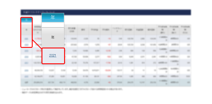 各取引ツールからトラックレコードを出力すると「年」単位で表示されます。「月」単位でデータを見たい「年」をタップまたはクリックします。