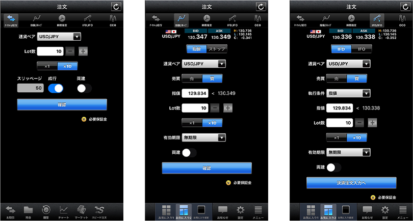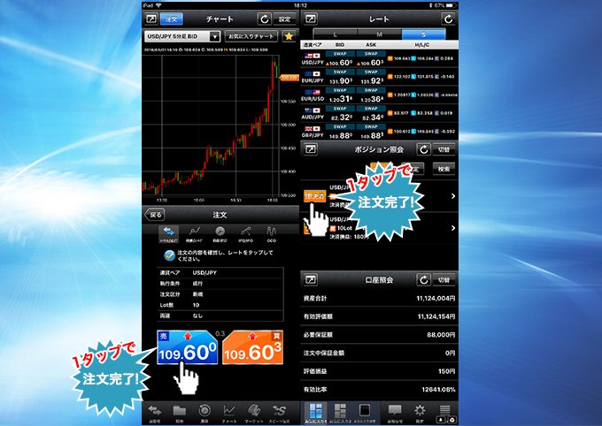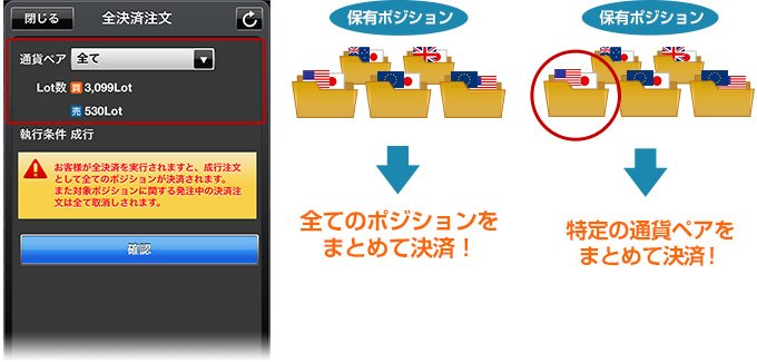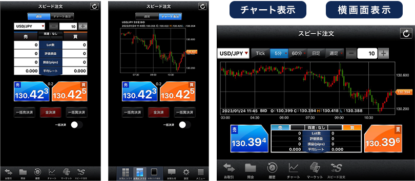1タップで新規注文、一括決済注文、全決済注文が発注できる機能を1画面に集約!短期トレードに特化した、よりスピーディーな取引が可能です。