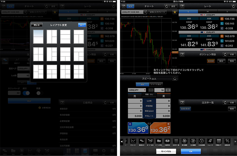 好きな画面レイアウトに変更ができ素早い取引にも対応できます。