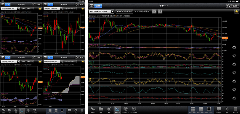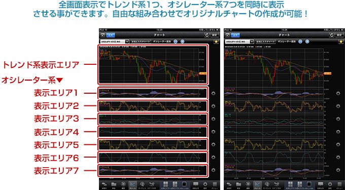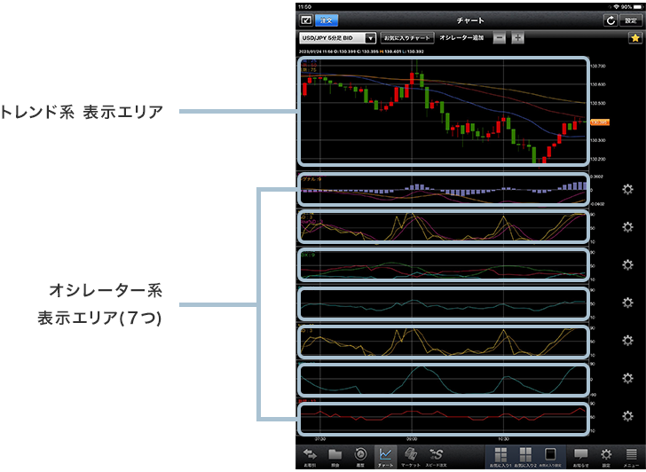 16種類ものテクニカルを搭載しており、全画面表示でトレンド系1つ、オシレーター系7つを同時に表示することができます。