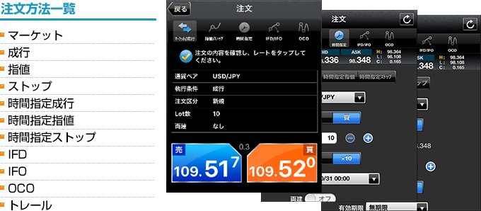 マーケット/成行/指値/ストップ/時間指定成行/時間指定指値/時間指定ストップ/IFD/IFO/OCO/トレール