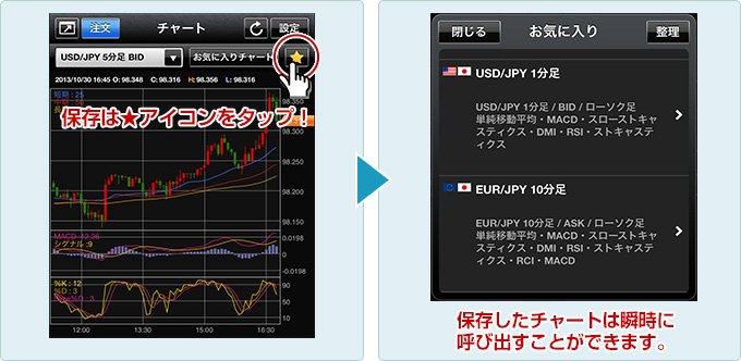 お気に入り機能で保存したオリジナルチャートを瞬時に呼び出すことができます。