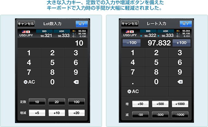 レート入力、Lot数入力時のキーボードに定数入力や増減ボタンが設置されており、さらに入力値が自由に設定できるためワンタップで数値入力ができます。