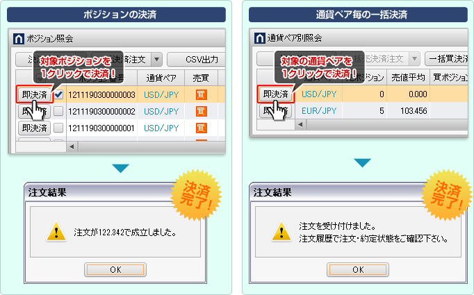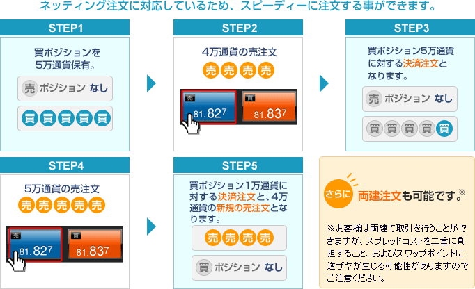 相場が思惑と反対方向に進んだ場合には、売値から買値を減じた差額に取引数量を乗じた(非・対円通貨ペアに限り、これに決済時点の当該通貨の当社対円取引レートを乗じた)金額の損失が発生しますのでご注意ください。最終的な売買損益は、この金額にスワップポイントを加え、売買手数料を減じた額となります。また、本取引ではお客様がお預けになった保証金額以上のお取引額で取引を行なうため、保証金額を上回る損失が発生する可能性がございます。