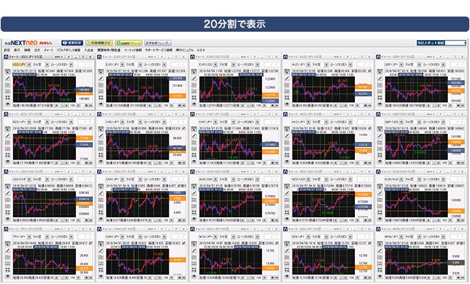 同一通貨ペアや複数の通貨ペアのチャート画面を最大20分割で表示できます。