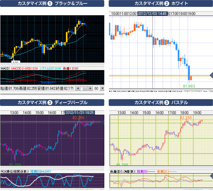 チャートの背景、各目盛線、周期線、ローソク足のカラー、テクニカルチャートカラー、テクニカル線幅等様々な設定を行う事が可能です。テンプレートとして利用する事ができるのでいつでも、自分だけの見やすいオリジナルチャートを使う事ができます。